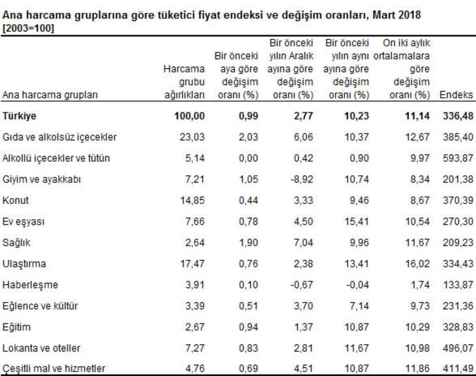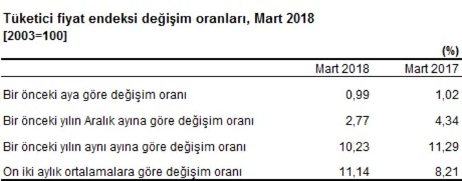 Türkiye İstatistik Kurumu (TÜİK) Mart ayı enflasyon rakamlarını açıkladı. TÜFE’de 2018 yılı Mart ayında bir önceki aya göre yüzde 0,99, bir önceki yılın Aralık ayına göre yüzde 2,77, bir önceki yılın aynı ayına göre yüzde 10,23 ve on iki aylık ortalamalara göre yüzde 11,14 artış gerçekleşti.