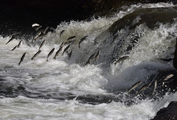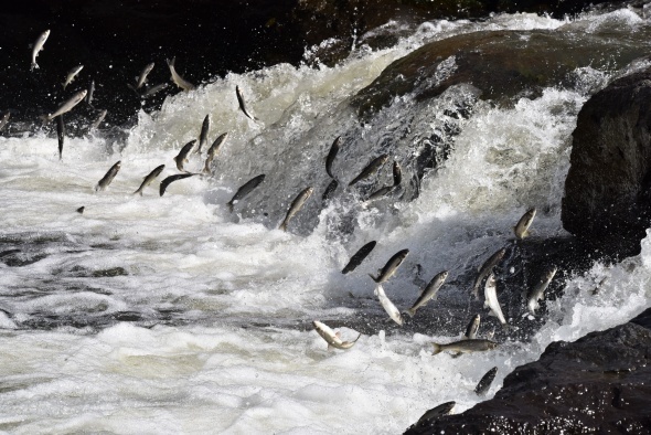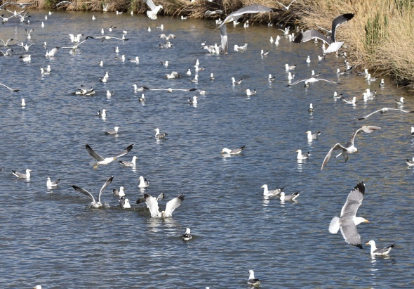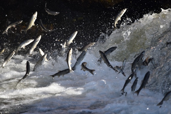 Yumurtalarını tatlı suya bırakmak için akarsulara akın eden inci kefali sürüleri martıların hücumuna uğruyor.
