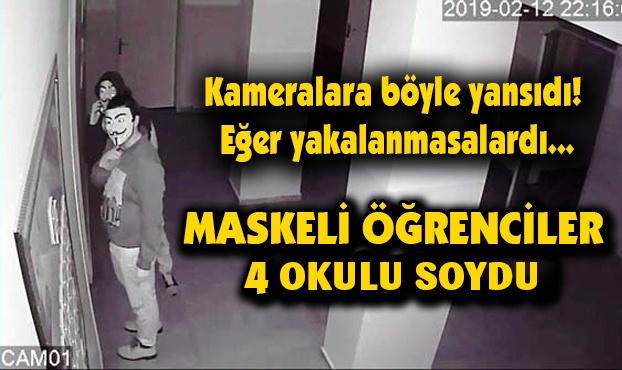 Aydın’ın Efeler ilçesinde, film karakterlerinin maskeleriyle dört okuldan hırsızlık yapan 3’ü öğrenci 4 şüpheli, polisin takibi sonucu yakalandı. Şüphelilerin, yakalanmasalardı, hırsızlık anına ait cep telefonuyla çektikleri görüntüleri sosyal medyadan paylaşmayı planladıkları belirlendi.