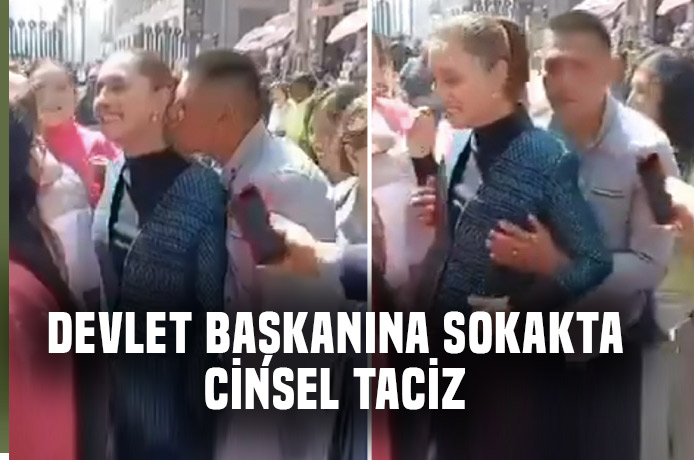 Meksika Devlet Başkanı Claudia Sheinbaum, halkla sohbet ettiği sırada sarhoş bir erkeğin tacizine uğradı. Saldırgan devlet başkanının önce beline sarılıp, daha sonra öpmeye çalışırken korumaların müdahalesiyle gözaltına alındı.