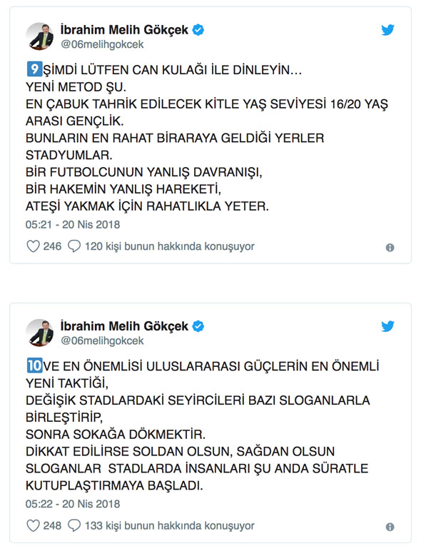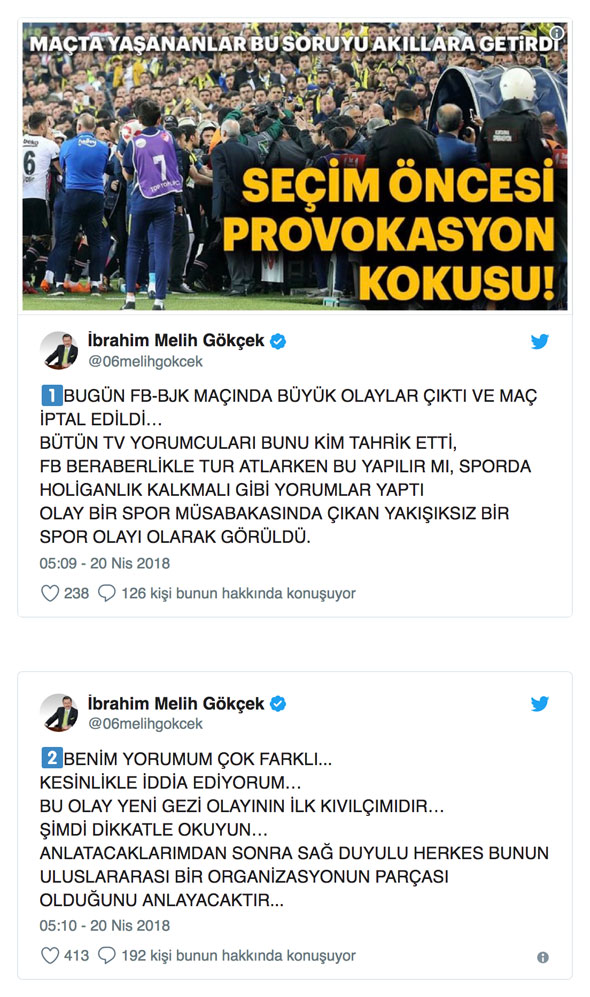 İspanyol Netflix dizisi La Casa De Papel'in fragmanında "2. Gezi hazırlığı ve Ali Koç'a suikast" mesajı verildiğini dile getiren Melih Gökçek, dün Fenerbahçe ile Beşiktaş arasında oynanan ve yarım kalan derbideki olayların işaretinin de La Casa De Papel'in fragmanında verildiğini iddia etti.