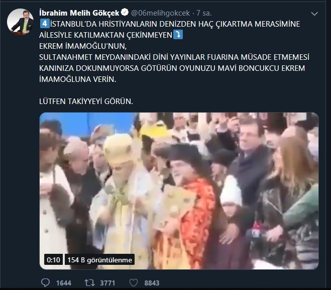İBB Başkanı olarak mazbatasını aldıktan sonra 37 yıldır her Ramazan ayında Sultanahmet Meydanında kurulan dini yayınlar fuarını yasaklayan İmamoğlu'nu eleştiren Melih Gökçek, "İstanbul’da Hristiyanların denizden haç çıkartma merasimine ailesiyle katılmaktan çekinmeyenEkrem İmamoğlu’nun, Sultanahmet meydanındaki dini yayınlar fuarına müsade etmemesi kanınıza dokunmuyorsa götürün oyunuzu mavi boncukcu Ekrem İmamoğlu’na verin. Lütfen takiyyeyi görün." ifadelerini kullandı.