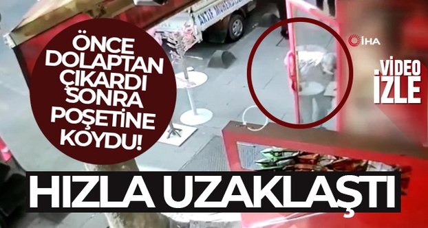 Sultangazi’de bir market önünde bulunan dolaptan meşrubat çalan şahıs kameralar yansıdı. Şahsın meşrubatları önce yere bıraktığı bir süre sonra ise cebinden çıkardığı poşete koyarak hızla uzaklaştığı görüldü.