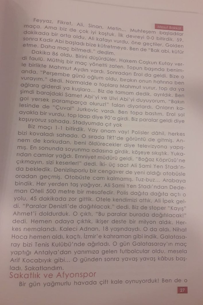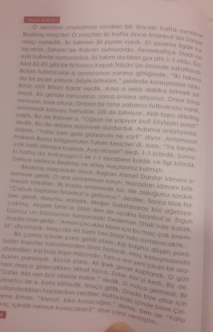 "Bir çanta içinde para geldi otele. Kişi başına düşen para bizim transfer taksidimizdem biraz fazlaydı. Maç konuşmasında söylediler; kişi başı işiker milyondu. Tam o ara yeni çıkan bir arabanın parasıydı. Büyük para. Ali İpek, genel kaptandı. O gün tam maça gidecekken Nihat Hoca, Zafer abiyi kesti. Biz de, 'Zafer abi sen bizi otelde bekle' dedik. O maça gelmedi. Bir yönetici ile 6. kata kilitledik. Maça gittik. Orada bize atlar için kullandıkları haplardan verdiler. Hatta maç içinde bizim Çingene Erhan, 'Mesut, ben kusacağım' demiş, ben de 'Yahu maç içinde nereye kusacaksın' yanıtını vermiştim."