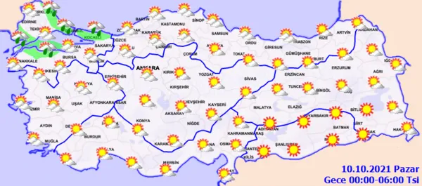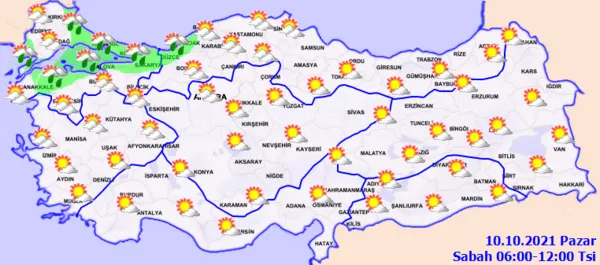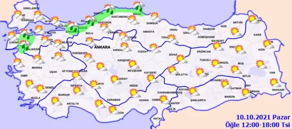 Meteoroloji Genel Müdürlüğü tarafından yapılan son değerlendirmelere göre: Ülkemizin kuzey ve batı kesimlerinin parçalı ve yer yer çok bulutlu, Batı Karadeniz kıyıları, İstanbul, Balıkesir, Kırklareli, Çanakkale, Kocaeli, Sakarya, Yalova, Bursa Çevreleri ile Edirne'nin güney ilçelerinin yerel olmak üzere sağanak yağışlı, diğer yerlerin az bulutlu ve açık geçeceği tahmin ediliyor. Sabah saatlerinde Batı Karadeniz kıyılarında sis ve pus hadisesi bekleniyor.
