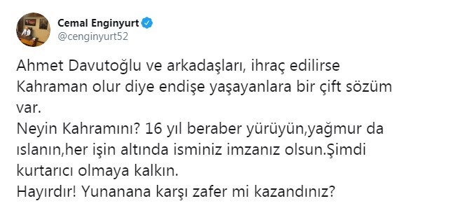 MHP Ordu Milletvekili Cemal Enginyurt, "Ahmet Davutoğluve arkadaşları, ihraç edilirse Kahraman olur diye endişe yaşayanlara bir çift sözüm var. Neyin Kahramını? 16 yıl beraber yürüyün,yağmur da ıslanın,her işin altında isminiz imzanız olsun. Şimdi kurtarıcı olmaya kalkın. Hayırdır! Yunanana karşı zafer mi kazandınız?" dedi