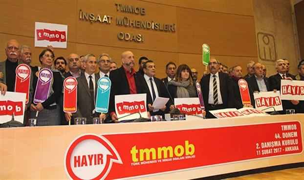 TMMOB'den yapılan açıklamada, şu ifadelere yer verildi; "Bu ülkenin mühendisi, mimarı ve şehir plancıları, piyasacı, emek ve doğa düşmanı, laiklik karşıtı düzeni kalıcılaştıracağı, filli olarak uygulanan dinci-mezhepçi dikta rejimine yasal statü kazandıracağı, bağımsızlık, cumhuriyet, demokrasi, laiklik bütünlüğüne darbe vuracağı, parlamenter demokrasiyi yasama, yargı, yürütme erkleri arasındaki denge, fren, denetleme mekanizmalarını, Meclisin yasamaya dair tek ve üst yetkili organ olma özelliğini bağımsız yargının varlık koşullarını ortadan kaldıracağı için Anayasa değişikliği teklifine 'Hayır' demektedir”
