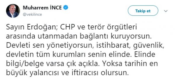 İnce paylaşımında şunları dile getirdi: "Sayın Erdoğan; CHP ve terör örgütleri arasında utanmadan bağlantı kuruyorsun. Devleti sen yönetiyorsun, istihbarat, güvenlik, devletin tüm kurumları senin elinde. Elinde bilgi/belge varsa çık açıkla. Yoksa tarihin en büyük yalancısı ve iftiracısı olursun."