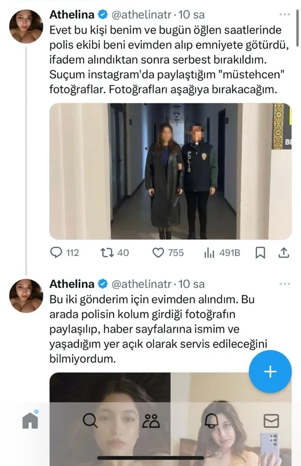 Emniyet Genel Müdürlüğü'ne bağlı Asayiş Daire Başkanlığı'na yapılan bir ihbar üzerine, sosyal medya hesabından müstehcen görüntüler sergilediği iddia edilen E.N.S Kocaeli'de gözaltına alındı. Yapılan işlemler sonrası serbest kalan kadın, gözaltına alınmasına neden olan fotoğrafları yeniden paylaşıp açıklamada bulundu.
