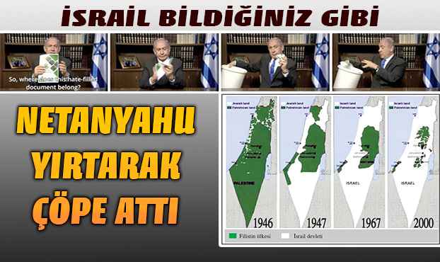 Hamas’ın Filistin devletini kurması durumunda İsrail’i yok etmek için uğraşacağını öne süren Netanyahu, konuşmasının sonunda elindeki Hamas’ın yeni siyaset belgesini yırtarak yanındaki çöp kutusuna attı.
