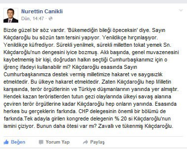 “Bizde güzel bir söz vardır; 'Bükemediğin bileği öpeceksin'” diyen Canikli, “Sayın Kılıçdaroğlu bu sözün tam tersini yapıyor. Yenildikçe hırçınlaşıyor. Yenildikçe küfrediyor. Sürekli yenilmek, sürekli milletten tokat yemek Sayın Kılıçdaroğlu'nun dengesini iyice bozmuş. Aklı başında, genel muvazenesini kaybetmemiş bir kişi, doğrudan halkın seçtiği Cumhurbaşkanımız için o iğrenç ifadeyi kullanabilir mi? Kılıçdaroğlu esasında Sayın Cumhurbaşkanımıza destek vermiş milletimize hakaret ve saygısızlık etmektedir. Bu ülkeye hakaret etmektedir. Zaten Kılıçdaroğlu hep milletin karşısında, terör örgütlerinin ve Türkiye düşmanlarının yanında yer almıştır. Hendek kazan teröristlerden tutun Gezi olaylarında ülkeyi savaş alanına çeviren terör örgütlerine kadar Kılıçdaroğlu hep onların yanında. Esasında herkes bu gerçeklerin farkında. CHP delegesinin önemli bir bölümü de farkında. Tek adayla girilen kongrede delegenin yüzde 20'si Kılıçdaroğlu'nun ismini çiziyor. Bunun daha ötesi var mı? Zavallı ve tükenmiş Kılıçdaroğlu” ifadelerini kullandı.