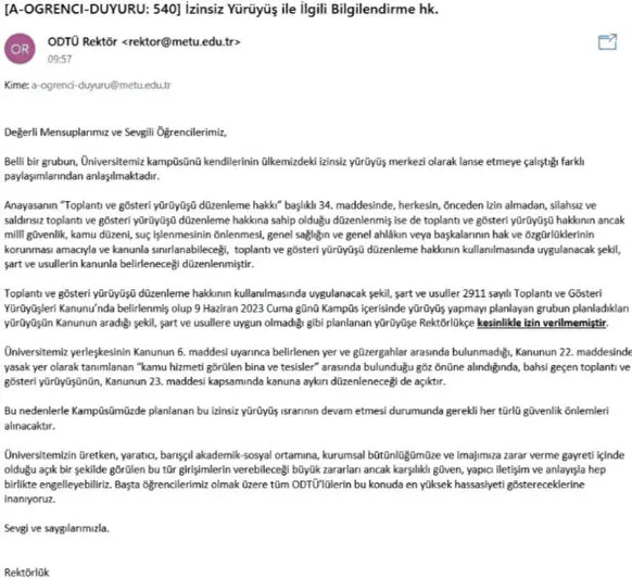 Rektörlük tarafından ODTÜ'lülere iletilen e-posta'da, yürüyüşün ısrarla yapılması durumunda güvenlik önlemlerinin hazır olacağı belirtilmişti. Yapılan uyarılara aldırış etmeyen grup izin yürüyüş yapmak istedi.