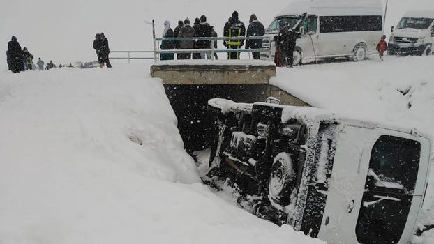 Rabit Çağan idaresindeki 65 V 1525 plakalı servis minibüsü, kar yağışı nedeniyle yoldan çıkarak şarampole devrildi.
