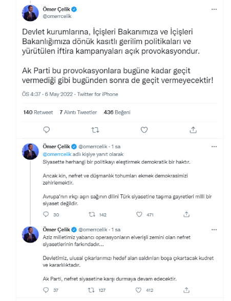 "Devlet kurumlarına, İçişleri Bakanımıza ve İçişleri Bakanlığımıza dönük kasıtlı gerilim politikaları ve yürütülen iftira kampanyaları açık provokasyondur." diyen Çelik, "AK Parti bu provokasyonlara bugüne kadar geçit vermediği gibi bugünden sonra de geçit vermeyecektir." ifadelerini kullandı.