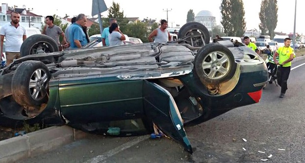 Balıkesir’in Edremit ilçesinde, otobüsün sıkıştırdığı otomobil orta bariyerlere çıkarak ters döndü. Ucuz atlatılan kazada, otomobilde bulunan 4 kişi yaralandı.