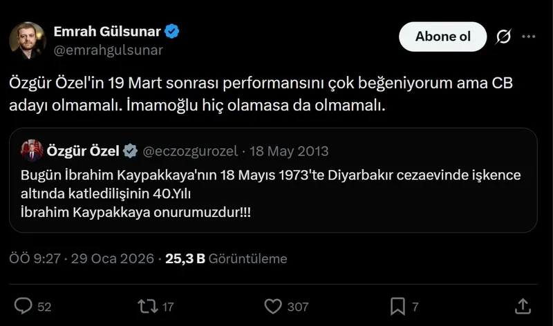 Özel'in 2013 tarihli "İbrahim Kaypakkaya onurumuzdur" paylaşımını alıntılayan Gülsunar, "19 Mart sonrası performansını çok beğeniyorum ama CB adayı olmamalı. İmamoğlu hiç olamasa da olmamalı"ifadelerini kullandı.