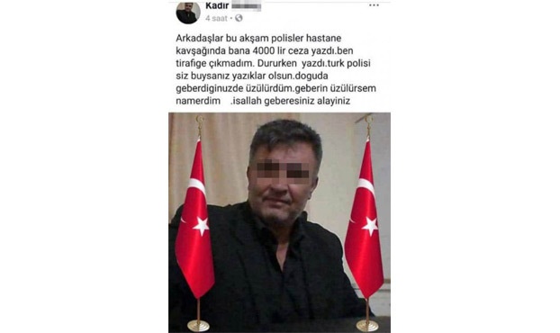 Hastane kavşağında trafik polisleri tarafından kendisine 4 bin TL ceza kesildiğini söyleyerek trafik polisleri hakkında ağır sözler sarf eden Kadir G. yaptığı paylaşımında"Arkadaşlar, bugün polisler hastane kavşağında bana 4 bin TL ceza yazdı. Ben trafiğe çıkmadım. Dururken yazdı. Türk polisi siz buysanız, yazıklar olsun. Doğuda geberdiğinizde üzülürdüm. Geberin, üzülürsem namerdim. İnşallah geberirsiniz alayınız." ifadelerini kullandı.
