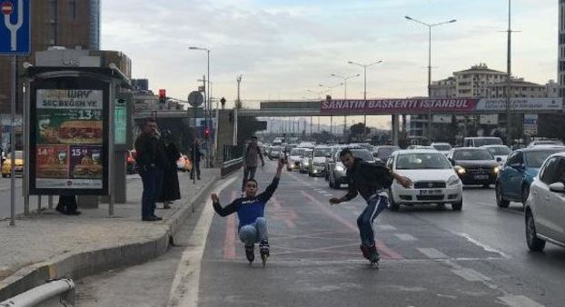 Kadıköy Kozyatağı D-100 kara yolu Ankara istikametinde ilerleyen sürücüler, trafikte şerit değiştiren gençleri görünce gözlerine inanamadı.