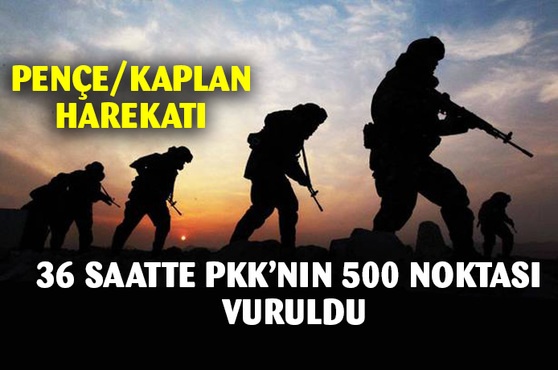 Pençe-Kaplan Operasyonu'nun ilk 36 saatinde terör örgütüne ait 500'den fazla hedef, top, Fırtına obüsü, ÇNRA, SİHA ve F-16 atışlarıyla imha edildi.