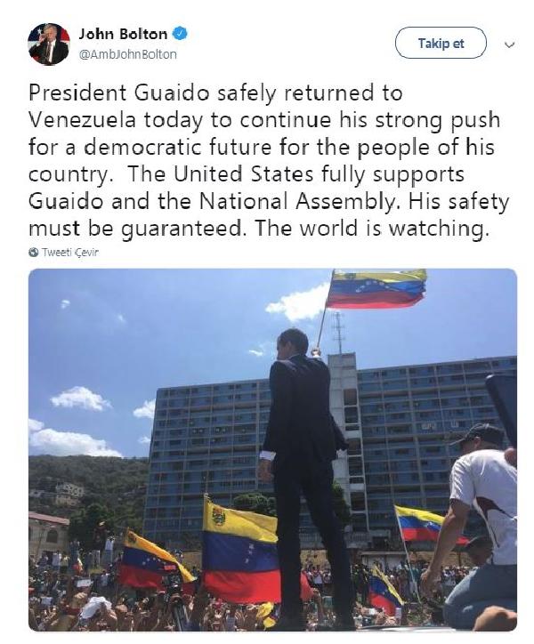 ABD Ulusal Güvenlik Danışmanı John Bolton da “Başkan Guaido, ülkesinin insanlarına demokratik bir gelecek sağlama mücadelesine devam etmek için bugün güvenli bir şekilde Venezuela’ya geri döndü. ABD tamamıyla Guaido’yu ve Ulusal Meclis’i destekliyor. Guaido’nun güvenliği garanti altına alınmalı. Tüm dünya izliyor.” dedi.