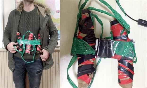 Öğrencilerden biri, terörü konu alan kısa filmin senaryosu gereği beline sardığı, kablo görünümü verdiği bantlarla kaplı silindir şeklindeki kartonlarla istasyona geldi, diğeri de kamerayla çekim yaptı.