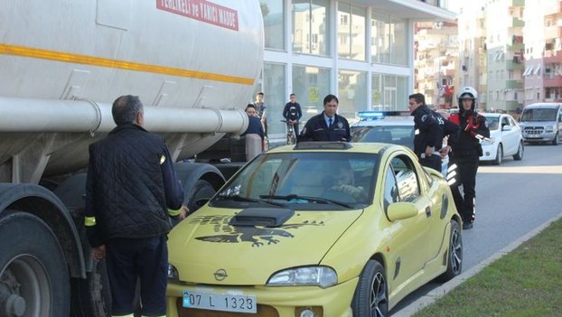 Otomobilin arkasındaki polis aracı, kaçan sürücüyü yakalamak için ilginç bir yol buldu. Çetin Emeç Caddesi'nde seyir halindeki bir tankere polis aracından anons yapan ekipler, aracı sola çekmesini söyledi. Durumu fark eden tanker şoförü, direksiyonu sola kırınca yanından geçmeye çalışan otomobil tanker ile refüj arasında sıkıştı. Hareket edemeyen araçtaki sürücü ise polis tarafından kıskıvrak yakalandı. Kelepçelenen sürücü gözaltına alındı. Sağlık kontrolünden geçirilen şahıs Manavgat İlçe Emniyet Müdürlüğüne götürüldü.