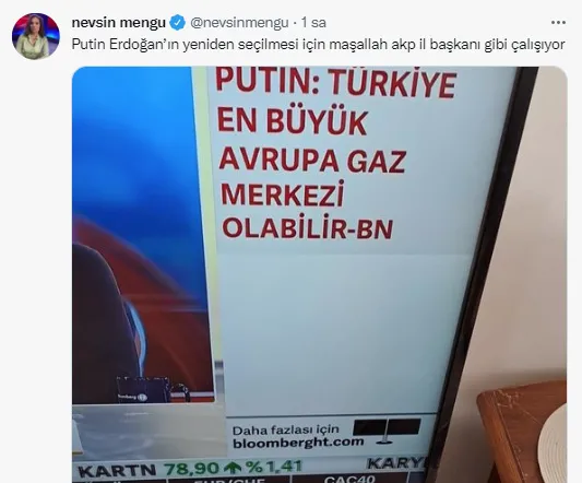 CHP'ye yakınlığıyla bilinen Nevşin Mengü, Twitter hesabından yaptığı paylaşımda, Putin'in Erdoğan'ın yeniden seçilmesi için AK Parti il başkanı gibi çalıştığını ifade etti.