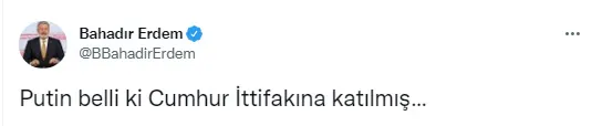 Putin'in "Türkiye'de Avrupa için doğalgaz merkezi kurabiliriz." açıklaması İYİ Parti Genel Başkan Yardımcısı Bahadır Erdem'i de rahatsız etti. Erdem ise Twitter hesabından yaptığı paylaşımda, "Putin belli ki Cumhur İttifakına katılmış…" dedi.