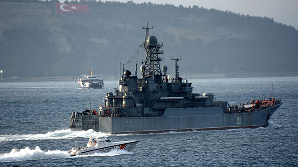Çanakkale Boğazı'ndan geçen Rus Donanması'nın Karadeniz Filosu'na bağlı 151 borda numaralı savaş gemisi 'Azov', Türk savaş gemisiyle karşılaştı. Güvertesinde askerlerin nöbet tuttuğu 'Azov'a, güvenlik nedeniyle Türk Sahil Güvenlik botu eşlik etti.