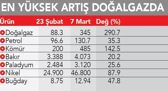 Batılı ülkelerin Rusya ekonomisini zayıflatmaya yönelik uyguladığı yaptırımlar, Rusya'nın önemli paya sahip olduğu birçok emtia ürününde fiyatları tüm zamanların en yüksek seviyesine taşıdı. Son bir yılda 10 kat artan doğalgaz fiyatı, savaşın başlamasıyla rekor tazeledi. 23 Şubat'ta megavatsaat başı 88.3 euro seviyesindeki vadeli doğalgaz fiyatı, 7 Mart'ta megavatsaat başı 345 euroya çıkarak yüzde 292 artış kaydetti. Brent petrolün varil fiyatı ise bu dönemde 96.6 dolar seviyesinden yüzde 35.3 artışla yüzde 130 doları geçti.