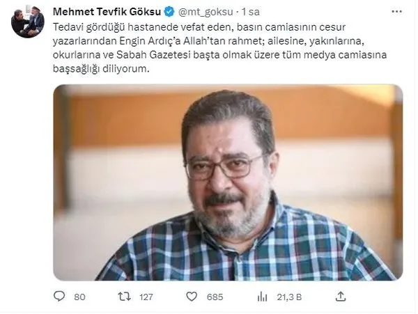 Sabah Gazetesi Yazarı Engin Ardıç'ın vefat haberini üzüntüyle öğrenmiş bulunmaktayız. Güçlü anlatım yeteneği ve keskin zekasının ürünü nüktedan yazılarıyla hep hafızalarda kalacak. Ailesinin ve sevenlerinin başı sağolsun. Allah rahmet eylesin.