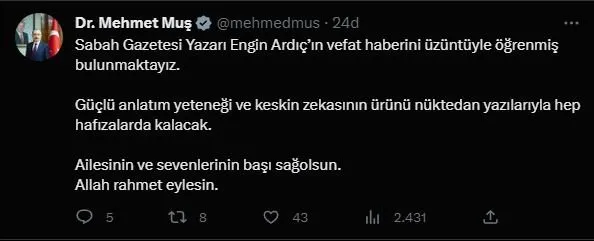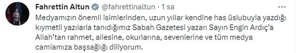 İletişim Başkanı Fahrettin Altun ise sosyal medya hesabından paylaştığı mesajında şu ifadeleri kullandı: Medyamızın önemli isimlerinden, uzun yıllar kendine has üslubuyla yazdığı kıymetli yazılarla tanıdığımız Sabah Gazetesi yazarı Sayın Engin Ardıç'a Allah'tan rahmet, ailesine, okurlarına, sevenlerine ve tüm medya camiamıza başsağlığı diliyorum.
