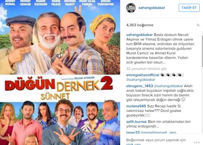 Şahan Gökbakr’ın, 'Başta dostum Necati Akpinar ve Yilmaz Erdoğan olmak üzere tüm BKM ailesine, ardindan da milyonlari basariyla sinema salonlarinda güldüren Murat Cemcir ve Ahmet Kural kardeşlerime başarilar dilerim. Yollari açik giseleri bol olsun' notuyla yaptığı paylaşım takipçilerinden olumlu tepkiler aldı.