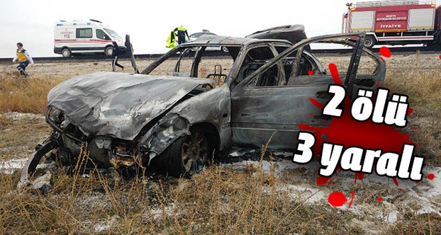 Konya’nın Ereğli ilçesinde bir otomobil, önce bir araca çarptı, ardından şarampole devrilerek alev aldı. Kazada, 2 kişi öldü, 3 kişi yaralandı.