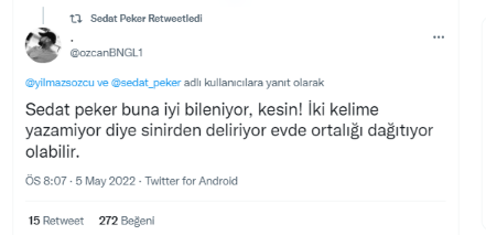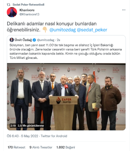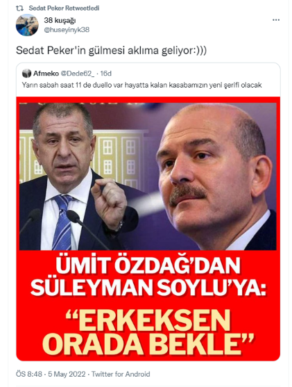 Ümit Özdağ'ın İçişleri Bakanı Süleyman Soylu'yu tehdit etmesinden sonra, firari mafya elebaşısı Sedat Peker'in Twitter hesabında hareketlilik yaşandı. Peker, Özdağ'ın çirkin üslubuna retweet ettiği mesajlarla destek verdi.