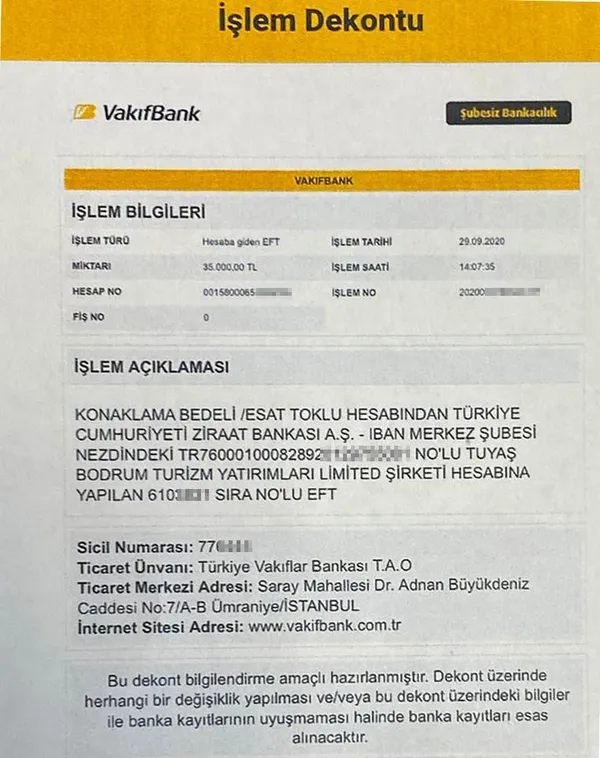 Toklu'nun Ankara Cumhuriyet Başsavcılığı'na verdiği şikayet dilekçesinde, "adı geçen otele 2020 yılı Eylül ayının sonlarına doğru ailemle tatil yapmak için gittim. Otel fiyatları da o dönemde uygun olduğu için rezervasyonu çok önceden bu tarihe yapmıştım. Konaklama bedeli ve oda kahvaltı olarak 35 bin lirayı otelin hesabına şahsi hesabımdan gönderdim. Buna dair dekont ektedir. İddia edildiğinin aksine, söz konusu otelde herhangi birinin misafiri olarak kalmadım" dedi.