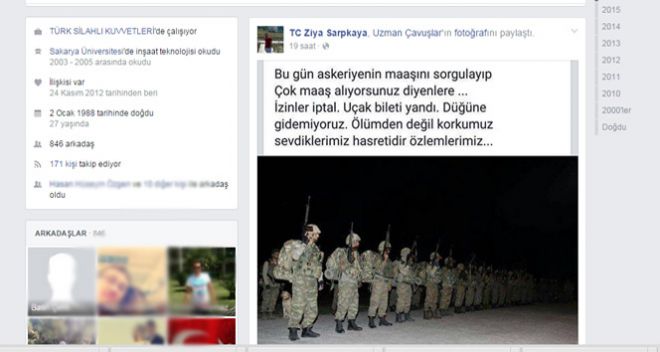 Şehit Uzman Çavuş Ziya Sarpkaya'nın sosyal medyada 19 saat önce şunları paylaşmış; "Bugün askeriyenin maaşını sorgulayıp çok maaş alıyorsunuz diyenlere...İzinler iptal.Uçak biletleri yandı.Düğüne gidemiyoruz.Ölümden değil korkumuz sevdiklerimiz hasretidir özlemlerimiz.."