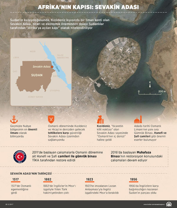 Sudan Dışişleri Bakanı İbrahim Ghandour, ülkenin Osmanlı İmparatorluğu’ndan kalma Sevakin liman kentiyle ilgili açıklama yaparak, Türkiye’nin Kızıldeniz kıyısındaki bu liman kentini yeniden onaracağını, sivil ve askeri gemilerin bakımı için bir rıhtım inşa edeceğini belirtti.