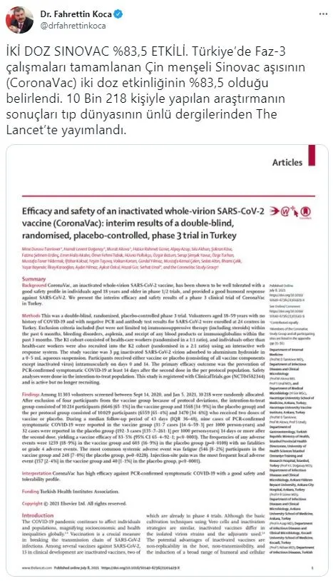 "İki doz Sinovac %83,5 etkili. Türkiye'de Faz-3 çalışmaları tamamlanan Çin menşeli Sinovac aşısının (CoronaVac) iki doz etkinliğinin %83,5 olduğu belirlendi. 10 Bin 218 kişiyle yapılan araştırmanın sonuçları tıp dünyasının ünlü dergilerinden The Lancet'te yayımlandı." ifadelerini kullandı.