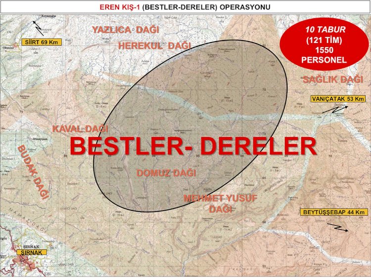 Bakanlıktan yapılan açıklamada, terör örgütü PKK'yı ülke gündeminden çıkarmak ve bölgede barındığı değerlendirilen teröristleri etkisiz hale getirmek amacıyla, Şırnak'ta, Eren Kış-1 Bestler-Dereler operasyonunun başlatıldığı kaydedildi.Şırnak Jandarma Bölge Komutanlığı sevk ve idaresinde, Jandarma Komando, JÖH, PÖH ve güvenlik koruculardan oluşan 121 timdeki 1550 personelin görev yaptığı belirtilen açıklamada, yurt içinde terörün tamamen ortadan kaldırılmasına yönelik yürütülen Eren kış operasyonlarının, halkın desteği ile inançlı ve kararlı bir şekilde başarıyla devam ettiği vurgulandı.