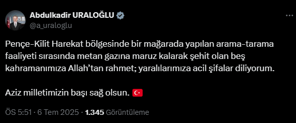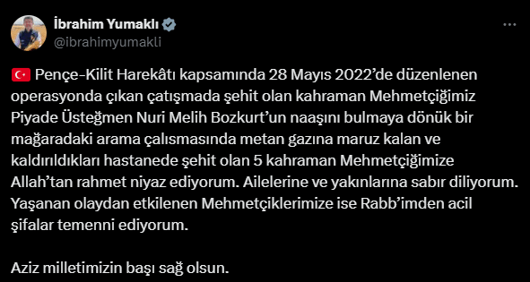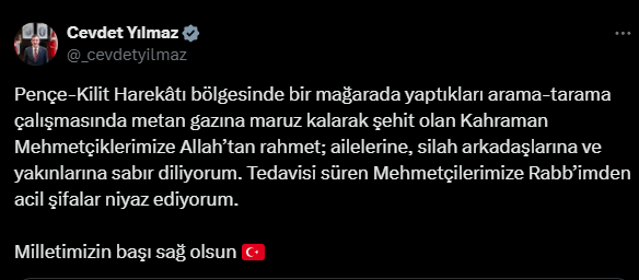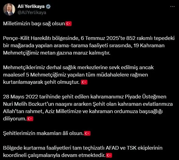 “Milletimizin başı sağ olsun Pençe-Kilit Harekâtı bölgesinde, 6 Temmuz 2025'te 852 rakımlı tepedeki bir mağarada yapılan arama-tarama faaliyeti sırasında, 19 Kahraman Mehmetçiğimiz metan gazına maruz kalmıştır. Mehmetçiklerimiz derhal sağlık merkezlerine sevk edilmiş ancak maalesef 5 Mehmetçiğimiz yapılan tüm müdahalelere rağmen kurtarılamayarak şehit olmuştur. 28 Mayıs 2022 tarihinde şehit edilen kahramanımız Piyade Üsteğmen Nuri Melih Bozkurt'un naaşını ararken Şehit olan kahraman evlatlarımıza Allah'tan rahmet, Aziz Milletimize ve kahraman ordumuza başsağlığı diliyorum. Şehitlerimizin makamları âli olsun. Bölgede kurtarma faaliyetleri tam teçhizatlı AFAD ve TSK ekiplerinin koordineli çalışmalarıyla devam etmektedir.”