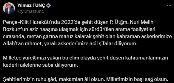 ADALET BAKANI YILMAZ TUNÇ: Pençe-Kilit Harekâtı'nda 2022'de şehit düşen P. Ütğm. Nuri Melih Bozkurt'un aziz naaşına ulaşmak için sürdürülen arama faaliyetleri sırasında, metan gazına maruz kalarak şehit olan kahraman askerlerimize Allah'tan rahmet, yaralı askerlerimize acil şifalar diliyorum. Milletçe yüreğimizi yakan bu elim olayda şehit düşen kahramanlarımızın kederli ailelerine sabır diliyorum. Şehitlerimizin ruhu şâd, makamları âli olsun. Milletimizin başı sağ olsun.