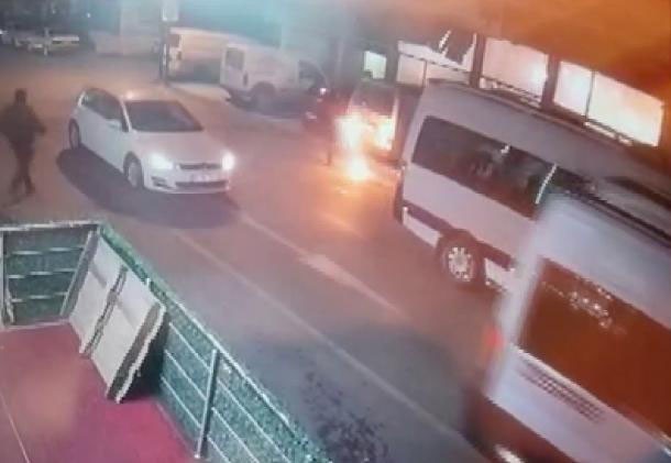 Pendik’te oto tamirhanesinde yemek yiyen grup içerisindeki bir genç, sobaya tiner kutusu atınca soba adeta bomba gibi patladı. Etrafa saçılan alevler, sobaya tiner kutusunu atan gencin üzerine de geldi. Adeta alev topuna dönen genç, alevler içerisinde koşarak kendisini dışarı attığı esnada yoldan geçen bir servis minibüsüne çarptı. Tiner kutusu atılan sobanın patladığı, yanan şahsın kendisini dışarıya attığı ve çevredekilerin yanan şahsa yardım ettiği anlar kameralara yansıdı.