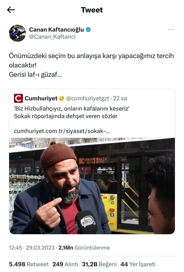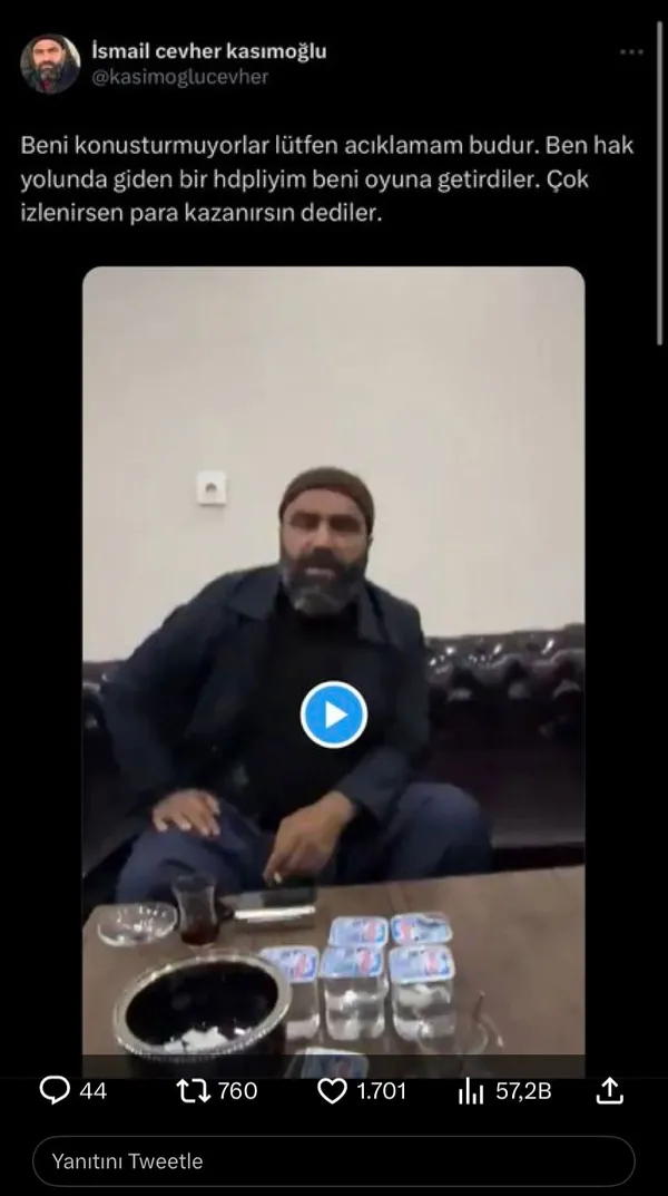 Batman’da “çok para kazanırsın” denilerek “Hizbullahçı olduğunu” öne süren kişinin sokak röportajındaki konuşması Cumhuriyet Gazetesi tarafından haberleştirildi. HDP-PKK konusunda sessiz kalan CHP’li Canan Kaftancıoğlu da hemen haberleştirilen kurgu videoyu sosyal medya hesabından paylaştı. Videodaki İsmail Cevher Kasımoğlu, “Ben hak yolunda giden bir HDP’liyim. Çok izlenirsen para kazanırsın dediler” açıklamasıyla videonun kurgu olduğunu ortaya çıkarırken, Kaftancıoğlu ve Cumhuriyet Gazetesi bu açıklamaları da görmezden geldi.