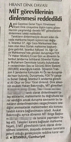 Yapılan duruşmayla ilgili Cumhuriyet ve Birgün Gazeteleri Dink'in avukatının talebini haberleştirirken dönemin MİT Bölge Başkanı ile MİT mensuplarının isimlerini açık olarak yazdı. İki gazetenin de Milli İstihbarat Teşkilatı'nın 27. maddesini ihlal etmesi dikkat çekti.