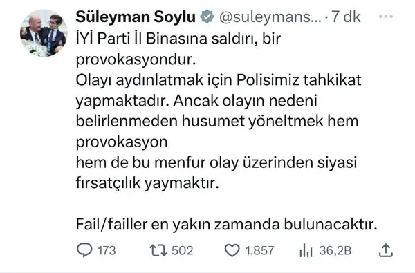 Soylu sosyal medyada şu açıklamayı yaptı: "İYİ Parti İl Binasına saldırı, bir provokasyondur. Olayı aydınlatmak için Polisimiz tahkikat yapmaktadır. Ancak olayın nedeni belirlenmeden husumet yöneltmek hem provokasyon hem de bu menfur olay üzerinden siyasi fırsatçılık yaymaktır. Fail/failler en yakın zamanda bulunacaktır."