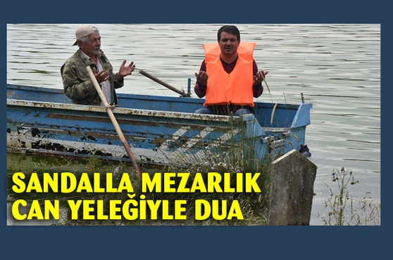 Bursa'nın İnegöl ilçesinde, 10 yıl önce yapılan baraj dolayısıyla sular altında kalan mezarlıkta yakınları bulunanlar, can yeleklerini giyip, sandalla açılarak, dua ediyor.