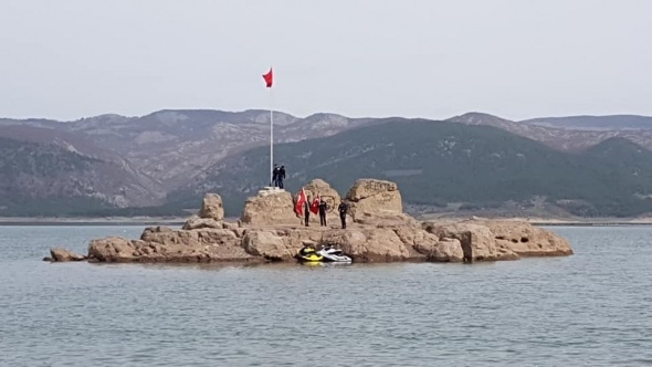 Türk Bayrağı dikili olan kayalığın yaklaşık 4 ay önceki fotoğrafı ile ekim ayında çekilen fotoğrafı arasındaki fark sudaki çekilmeyi gözler önüne koyuyor.
