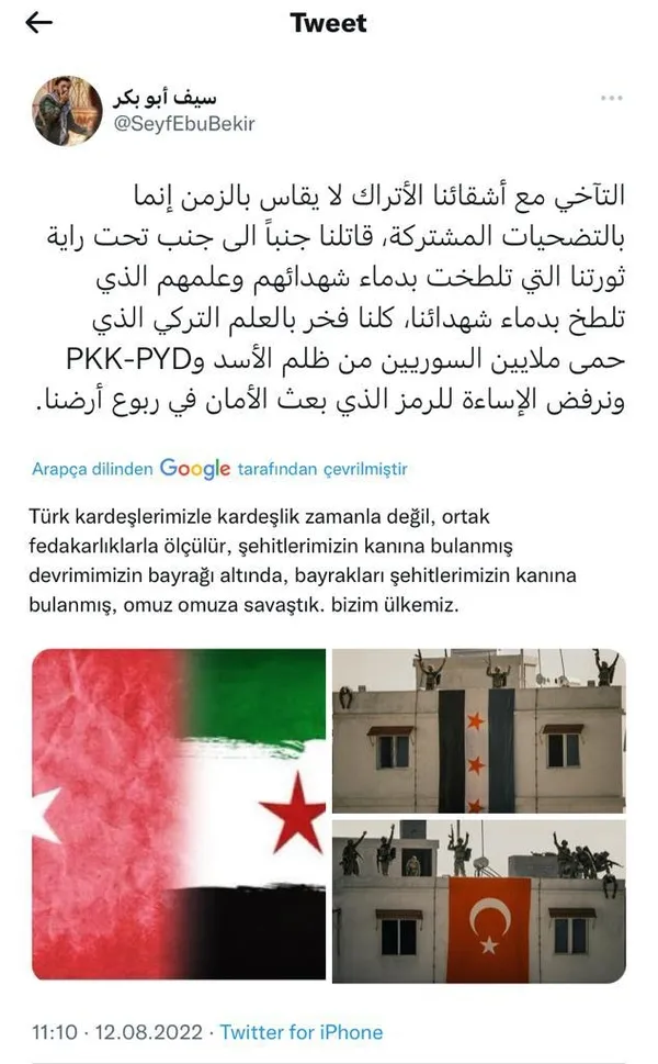 Hamzat Grubu Komutanı Seyf Ebubekir, sosyal medya hesabından "Türk kardeşlerimizle kardeşlik zamanla değil, ortak fedakarlıklarla ölçülür. Şehitlerimizin kanına bulanmış devrimimizin bayrağı altında, bayrakları şehitlerimizin kanına bulanmış, omuz omuza savaştık" şeklinde paylaşım yaparak tepkisini gösterdi.