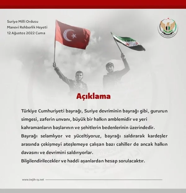 Dışişleri Bakanı Mevlüt Çavuşoğlu’nun "Muhalif olan Suriyelilerle rejim arasında bir barışın olması gerektiğini, Türkiye olarak da böyle bir durumda buna destek olabileceğimizi de söyledik" açıklaması sonrası Suriyeli muhalifler Türk bayrağını alçakça saldırarak yakma girişiminde bulundu. İlk tepki ise Suriye Geçici Hükümeti ile Hamzat ve Şurta Komutanlarından geldi. Esad'ın ve PKK-PYD'nin zulmünden sonra topraklarına güvenliği getiren Türk bayrağına rencide edilmesini reddetiyoruz şeklinde açıklamalarda bulundu.